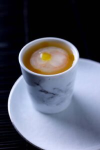 - 牡蠣と滑らかなジャガイモのヴルーテを合わせた温かい一皿