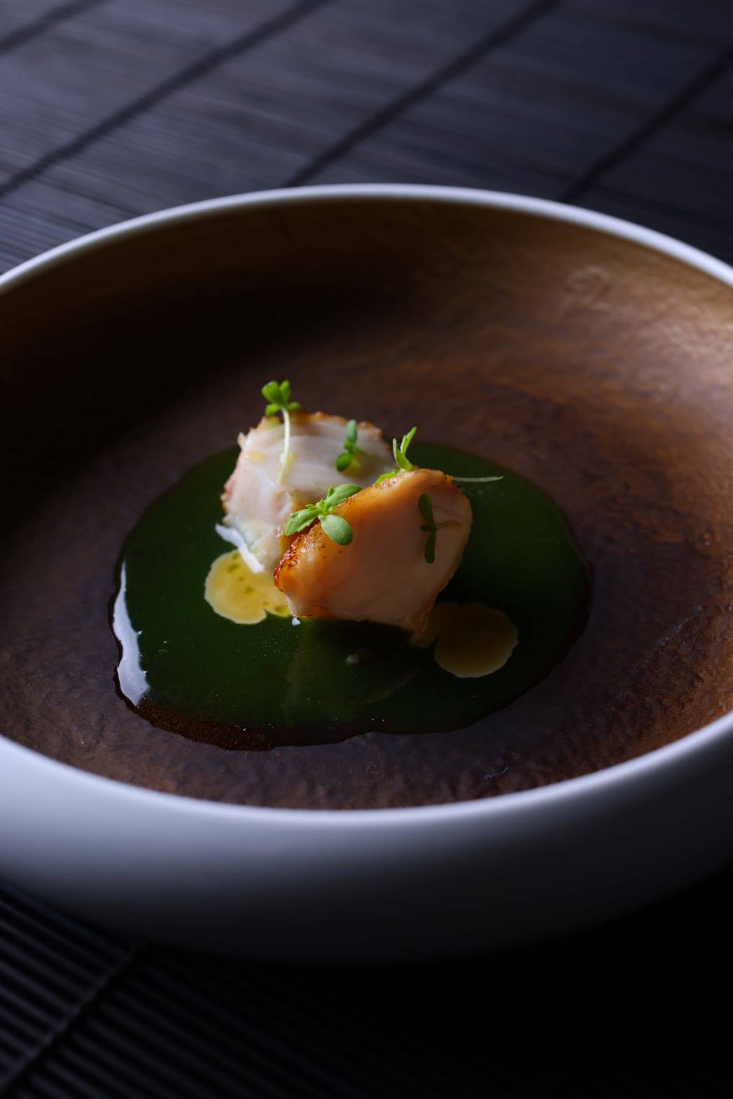 - Charcoal-grilled pufferfish milt, Royal, and butterbur sprouts